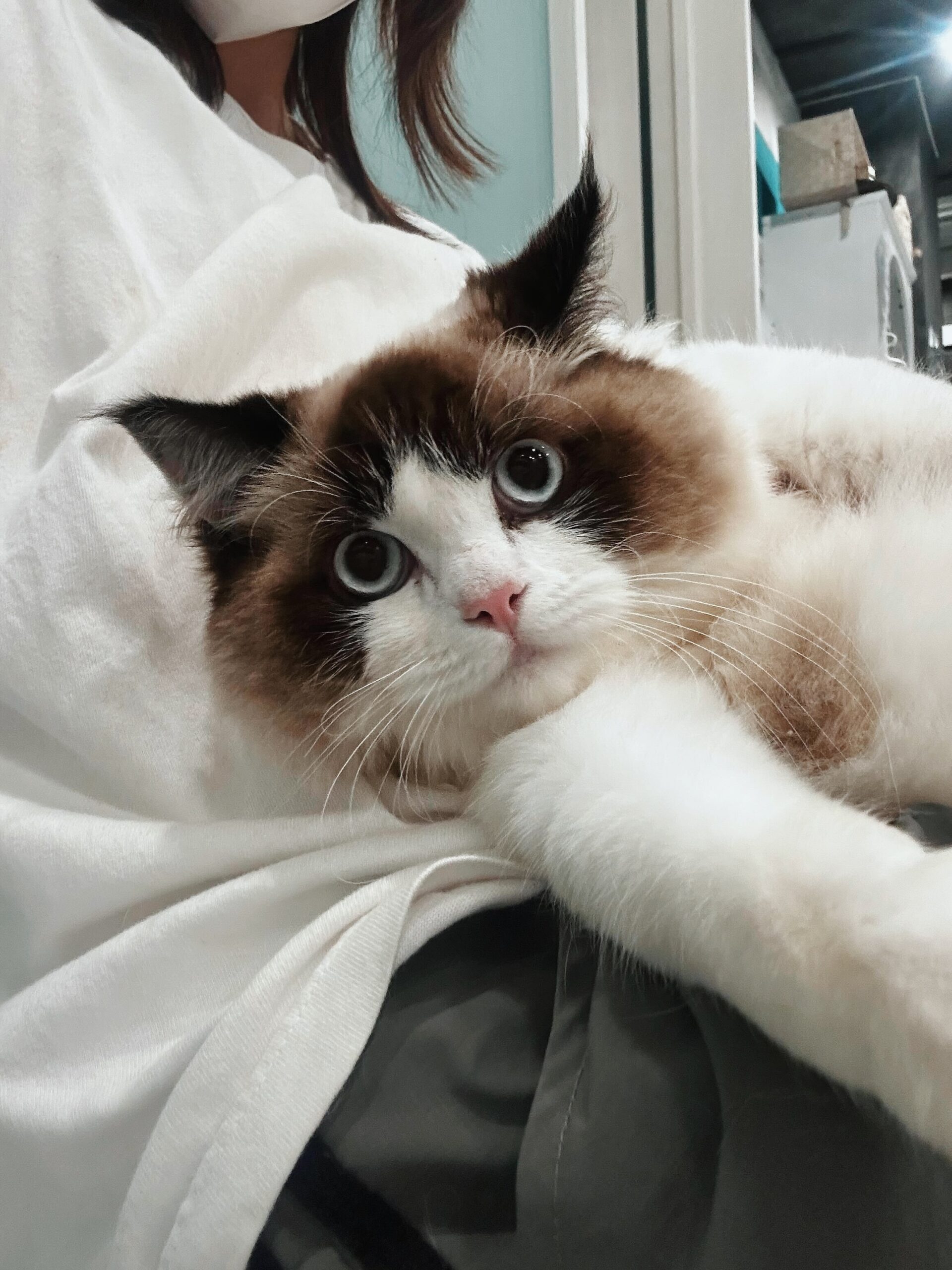 シールポイントバイカラーの美しい毛色が魅力のマッスルちゃん。