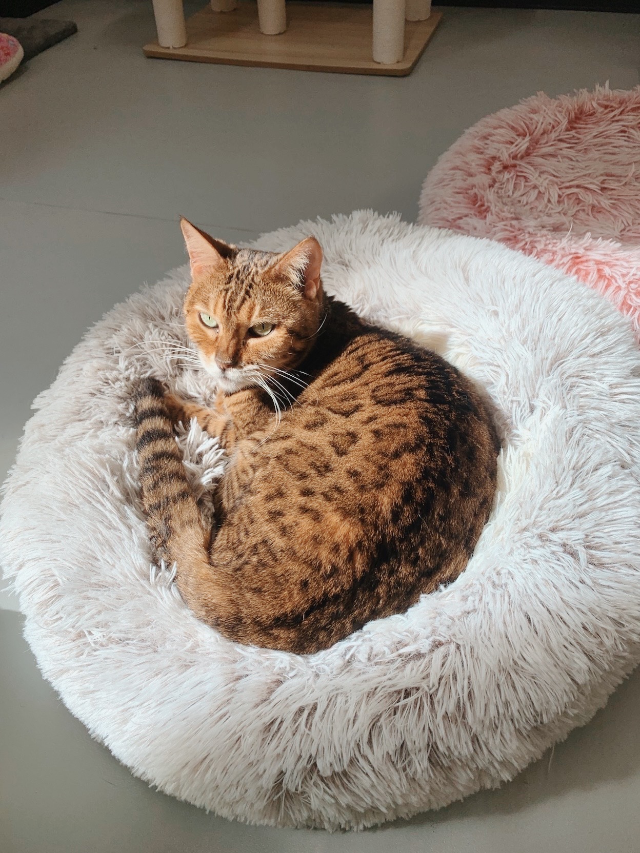 美しいブラウンスポテッドタビーの被毛が魅力的なロロちゃん。はじめましての人には少し慎重な一面がありますが、ゆっくり距離を縮めていくと、とても甘えん坊な表情を見せてくれます。